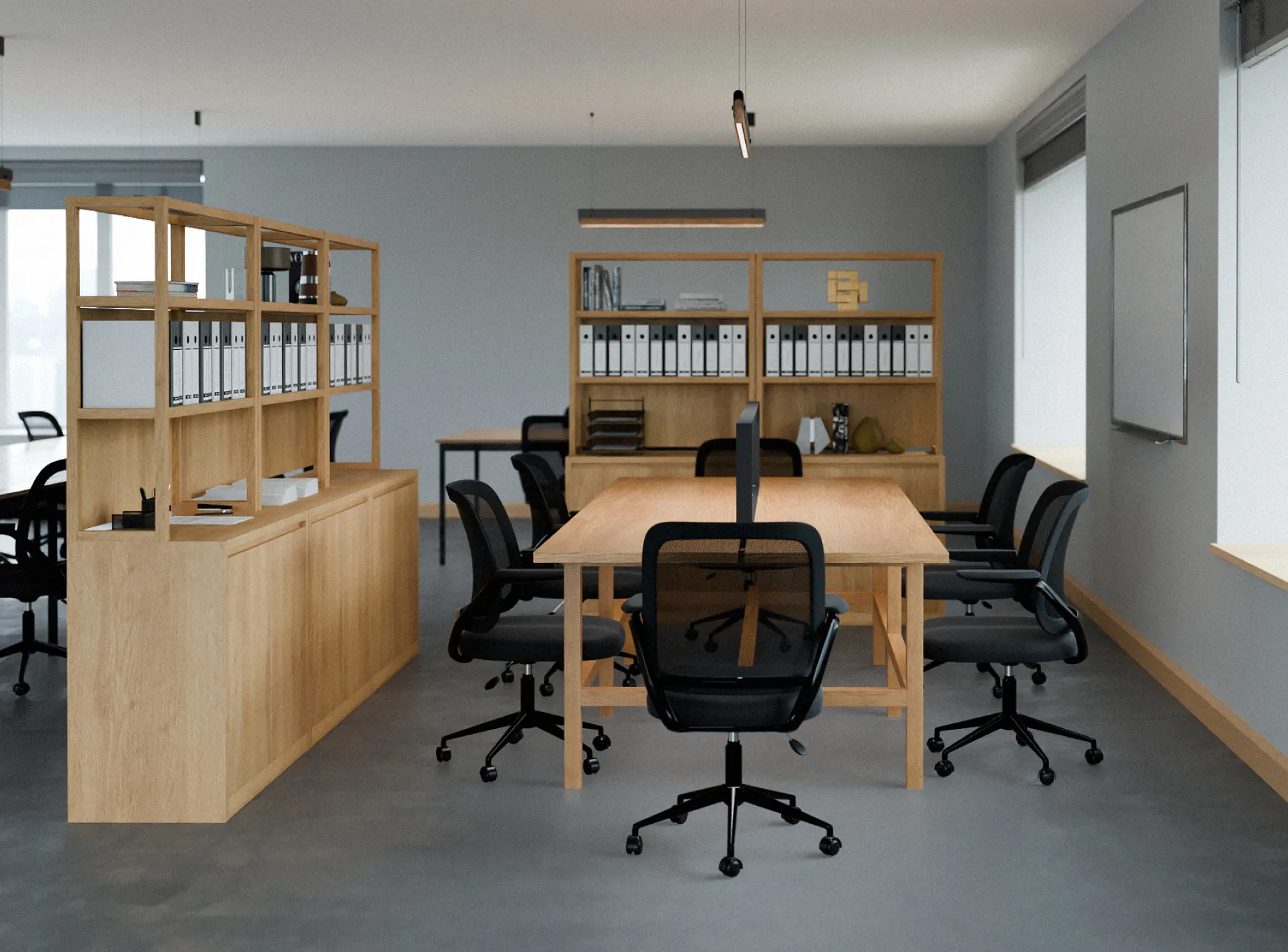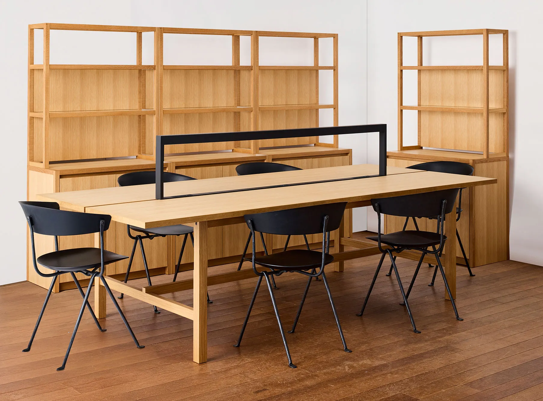 書類などを整理するための十分な収納力を持ちながら、高さと奥行きは、圧迫感を与えすぎずに空間を仕切る理想的なパーテーションとして設計されています。デスクの周りにL字に組み合わせて設置することで、オフィスに集中のためのパーソナルな領域を生み出す、空間設計の中核を担う機能的なユニットです。