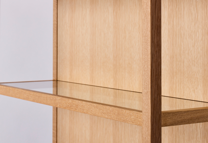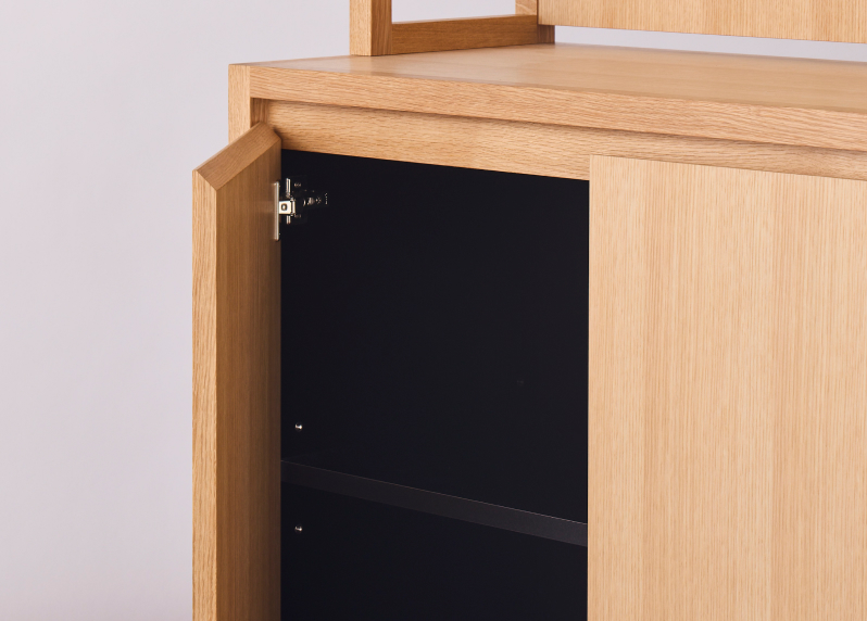 天板には、上質なガラスを採用しました。これは、収納物の視認性を高めながら、上部からの光を透過させ、空間に軽やかさと広がりをもたらすデザインの工夫。ガラス特有のシャープな輝きが、シェルフ全体のデザインを洗練させ、「MIKAMI STANDARD」の美意識を強調します。