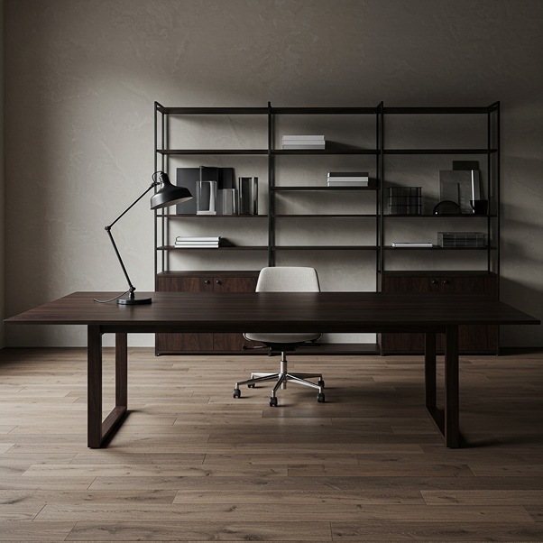「MIKAMI STANDARD」の美意識は、このオフィスデスクの細部にまで貫かれています。かつて船舶家具で培った技術を活かし、堅牢で重厚でありながら、見た目の圧迫感を抑えた洗練されたデザインを実現しました。シンプルでありながら、細部に施された処理は、職人の高い技術と丁寧な手仕事を感じさせます。